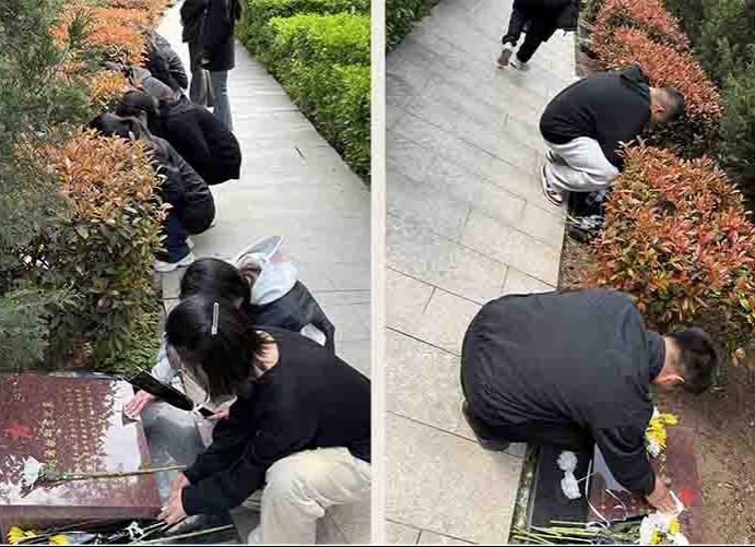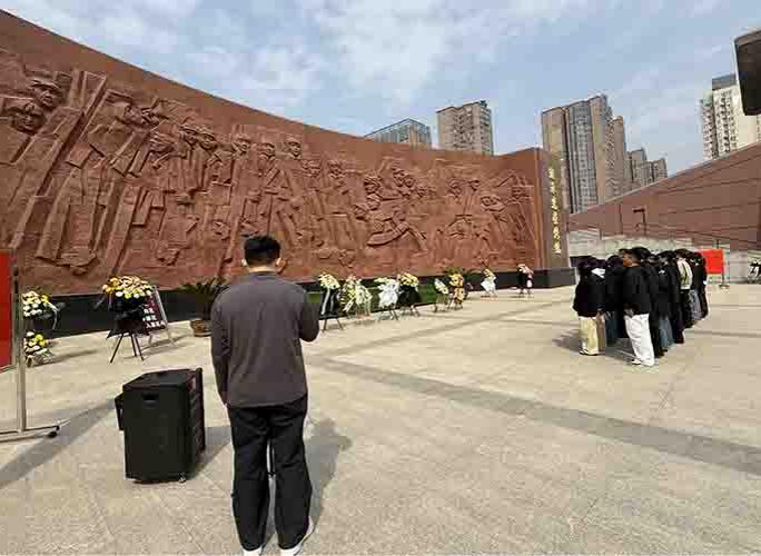在烈士墓区,师生分组开展祭扫活动。大家擦拭墓碑、清除灰尘,以朴素行动缅怀先烈;随后,同学们依次献花、鞠躬,追思先烈事迹,感悟初心使命。祭扫仪式后,师生参观烈士陵园的革命历史浮雕墙,在浮雕前回望岁月、重温历史,深化对红色精神的理解与感悟。
